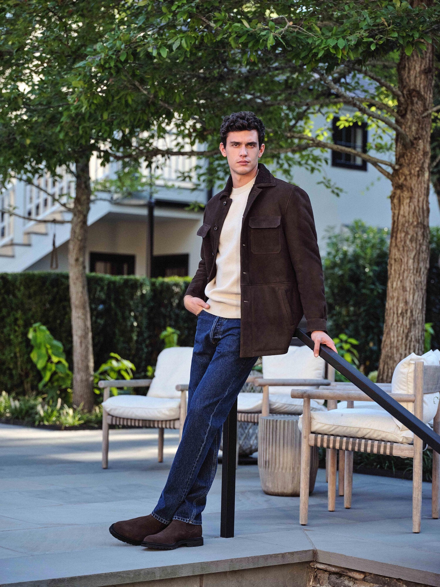 He wears the Dark Brown Suede Shearling Button Through Jacket, the Beige Japanese Wool Crew Neck Sweater and the Dark Wash Denim Easy Fit Jeans.