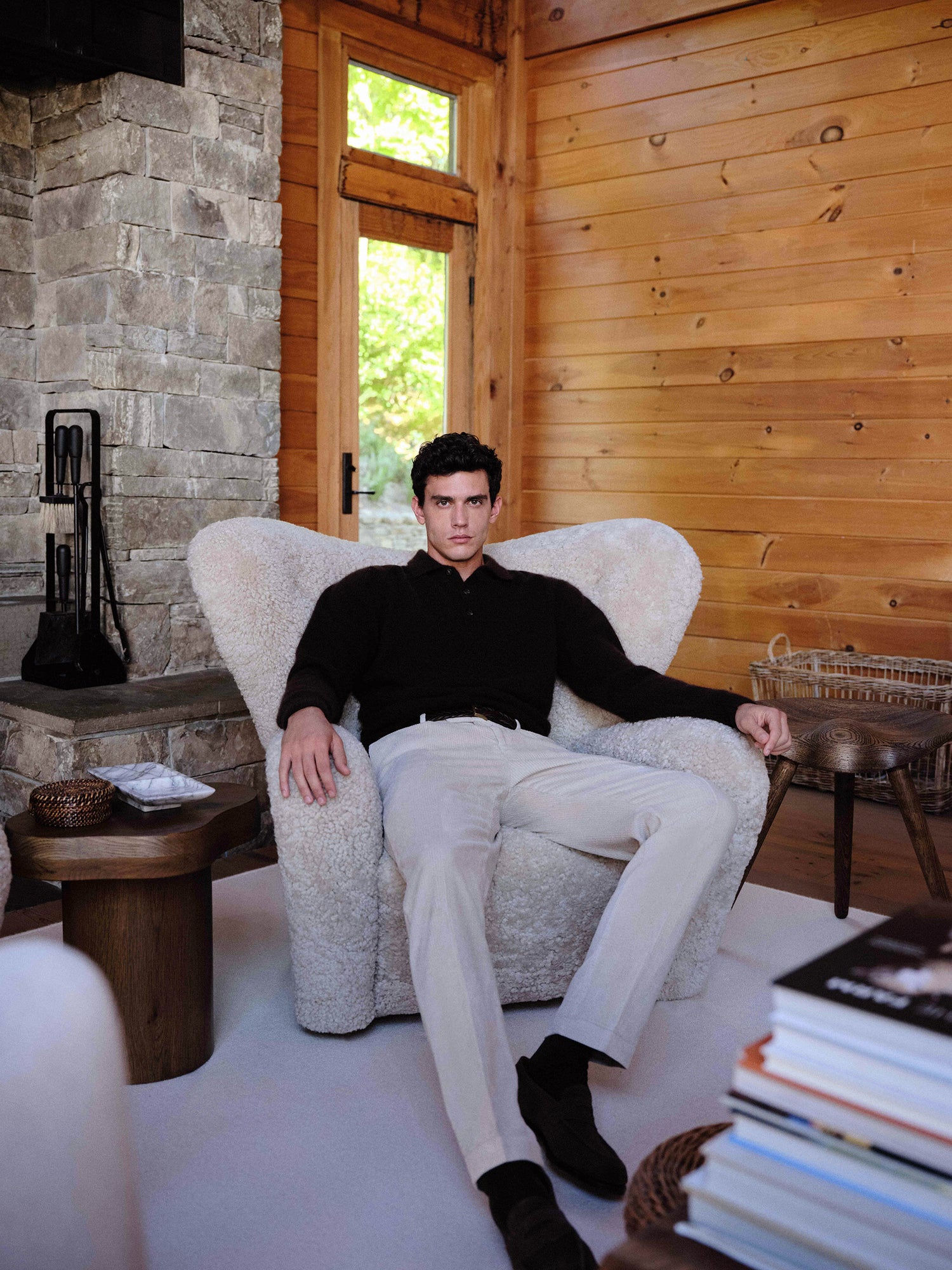 He wears the Dark Brown Brushed Cashmere Silk Long Sleeve Polo Shirt, the Off White Corduroy Single Pleat Chino and the Brown Woven Leather Belt.