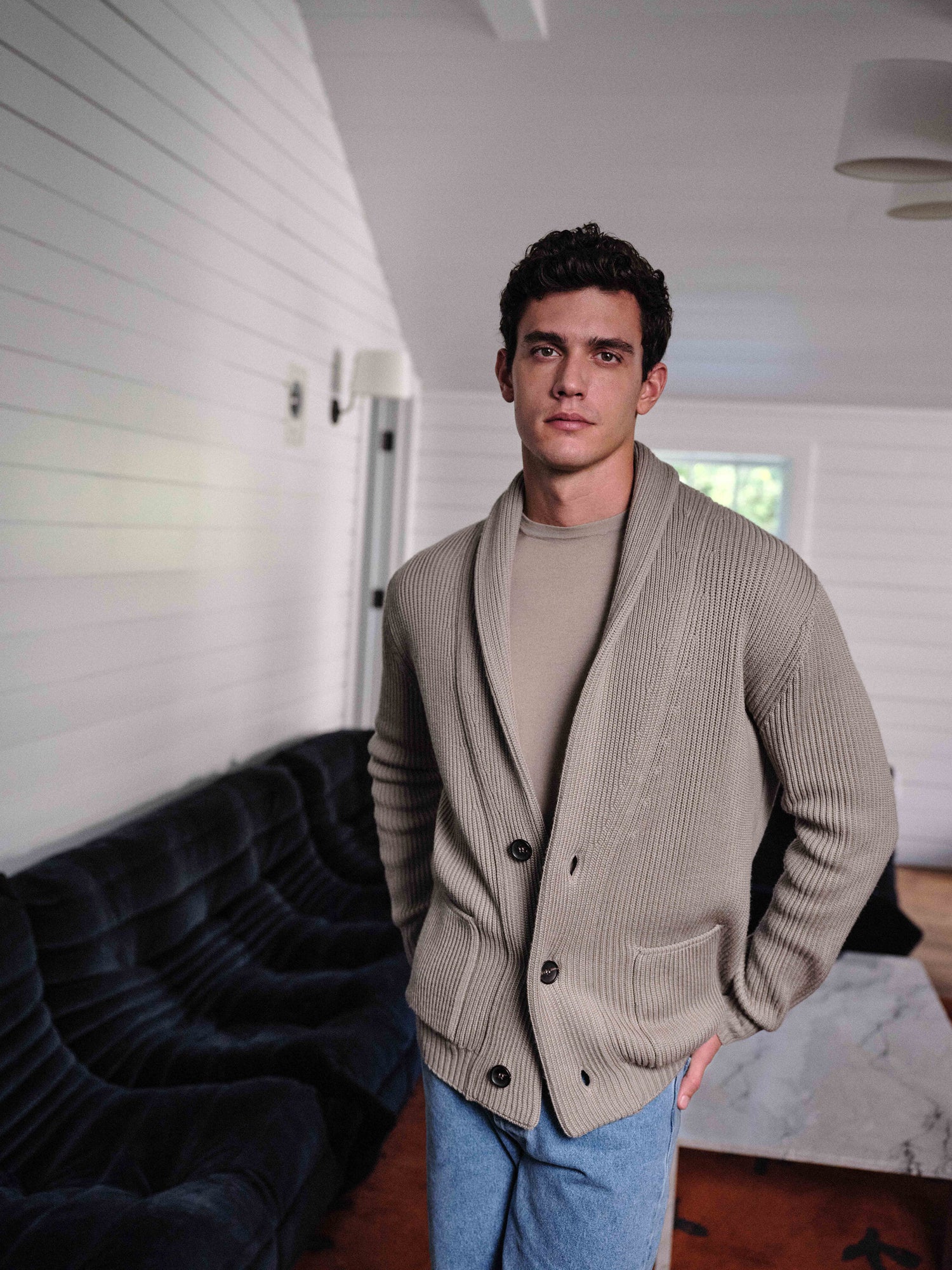 He wears the Taupe Merino Wool Single Breasted Shawl Cardigan, the Taupe Merino Wool Extrafine Crew Neck Sweater and the Mid Blue Easy Fit Denim Jeans.