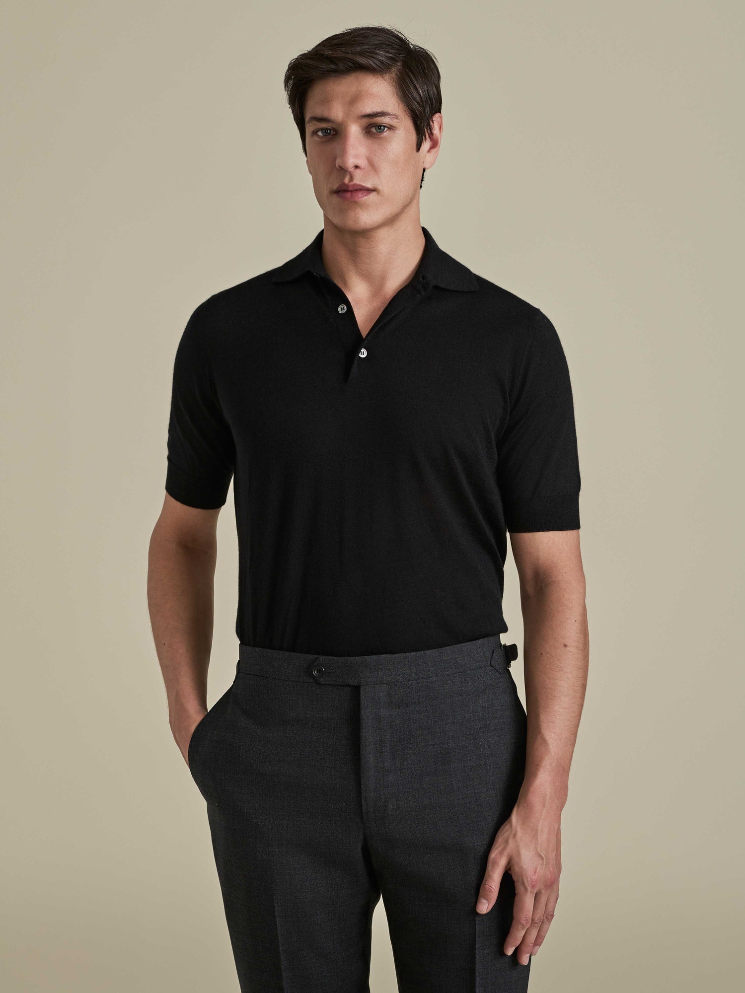 An opulent take on the classic polo shirt, reimagined in a black colour cashmere silk fabric. Handmade in Italy, it’s designed to be the ultimate summer polo, and is most at home on sun-drenched terraces somewhere in the Riviera.