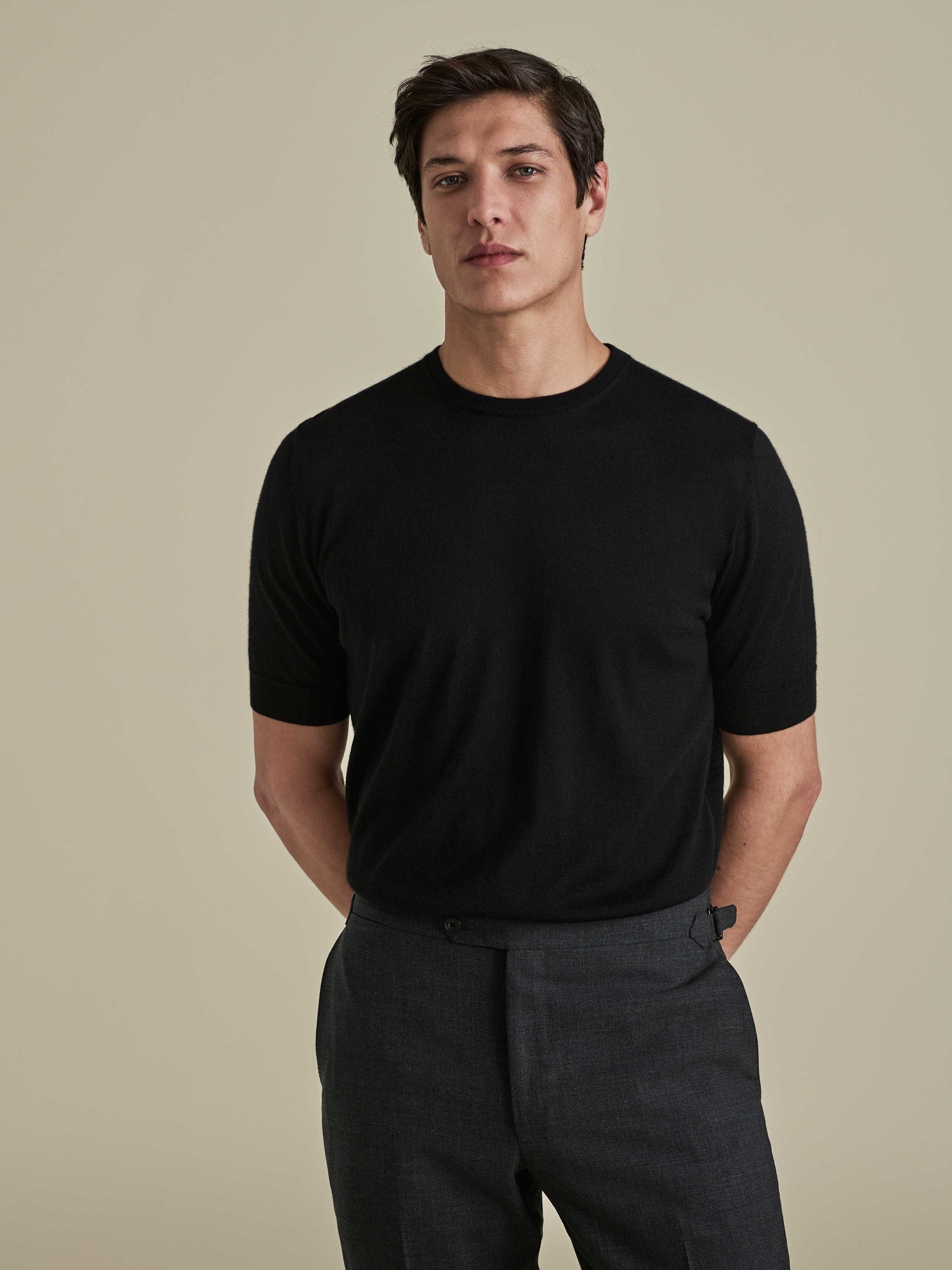 Crafted in Italy from the softest cashmere silk, this black T-shirt is summer knitwear at its most refined. With ribbed cuffs and hem, a flattering tailored fit and set-in short sleeves, it’s a comfortable, elegant option that’s smarter than a regular T-shirt but more relaxed than a polo.