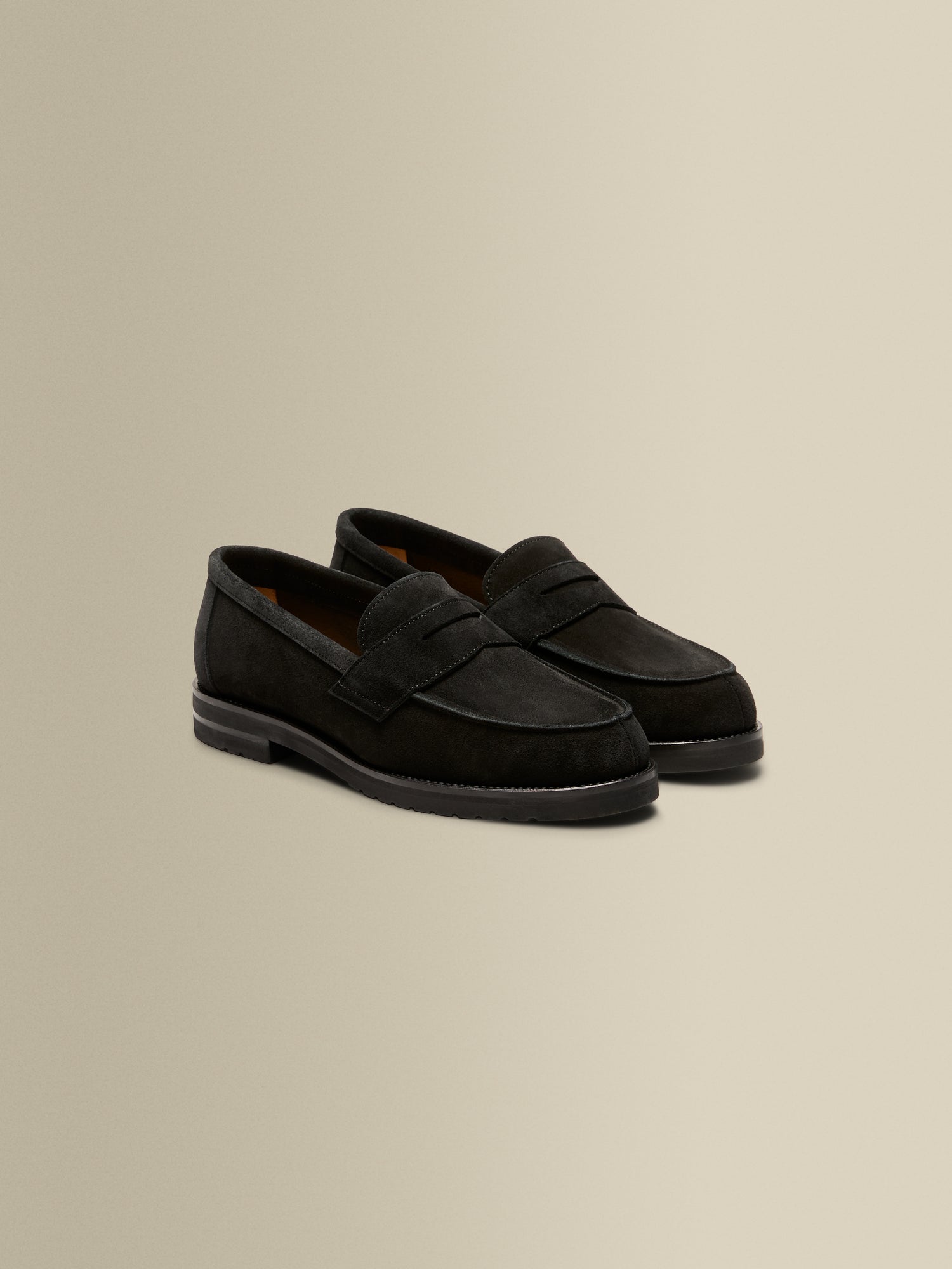 Handmade in Italy using traditional artisanal methods, these black penny loafers are crafted from plush Italian suede. They’re set on lightweight Vibram V-Lite Lug rubber soles, offering cushioned ease underfoot without compromising on style.