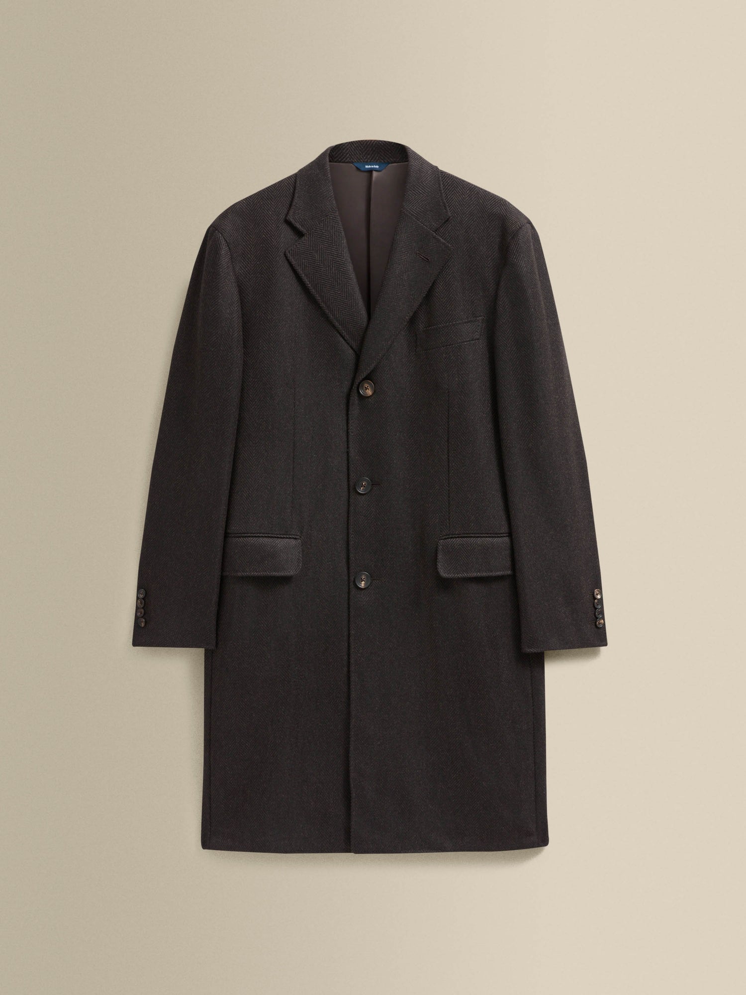 With its classic silhouette and flattering tailored fit, this brown herringbone cashmere overcoat takes some beating. Crafted with a single-breasted front and broad notch lapels, its mid length cut makes it versatile and easy to wear.