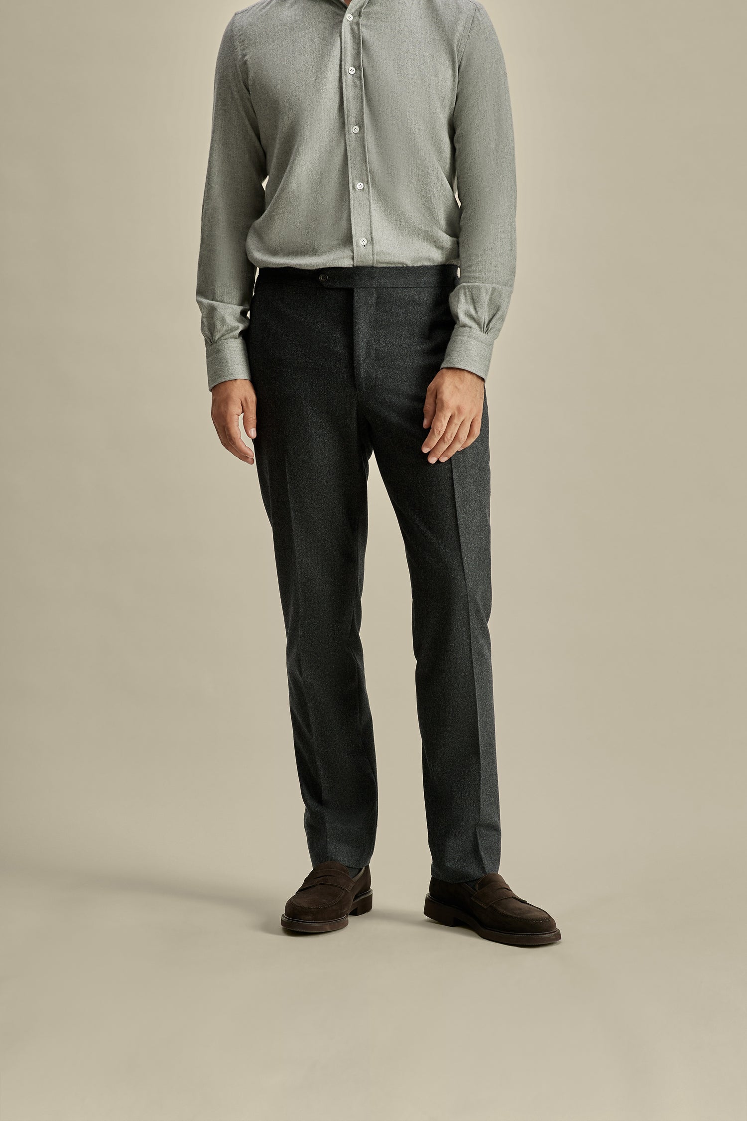 The texture of flannel means these trousers work especially well with knitwear, either with our brushed cashmere or chunkier fisherman jumpers. Try them with the former, and dress them up further with a pair of leather derbies.