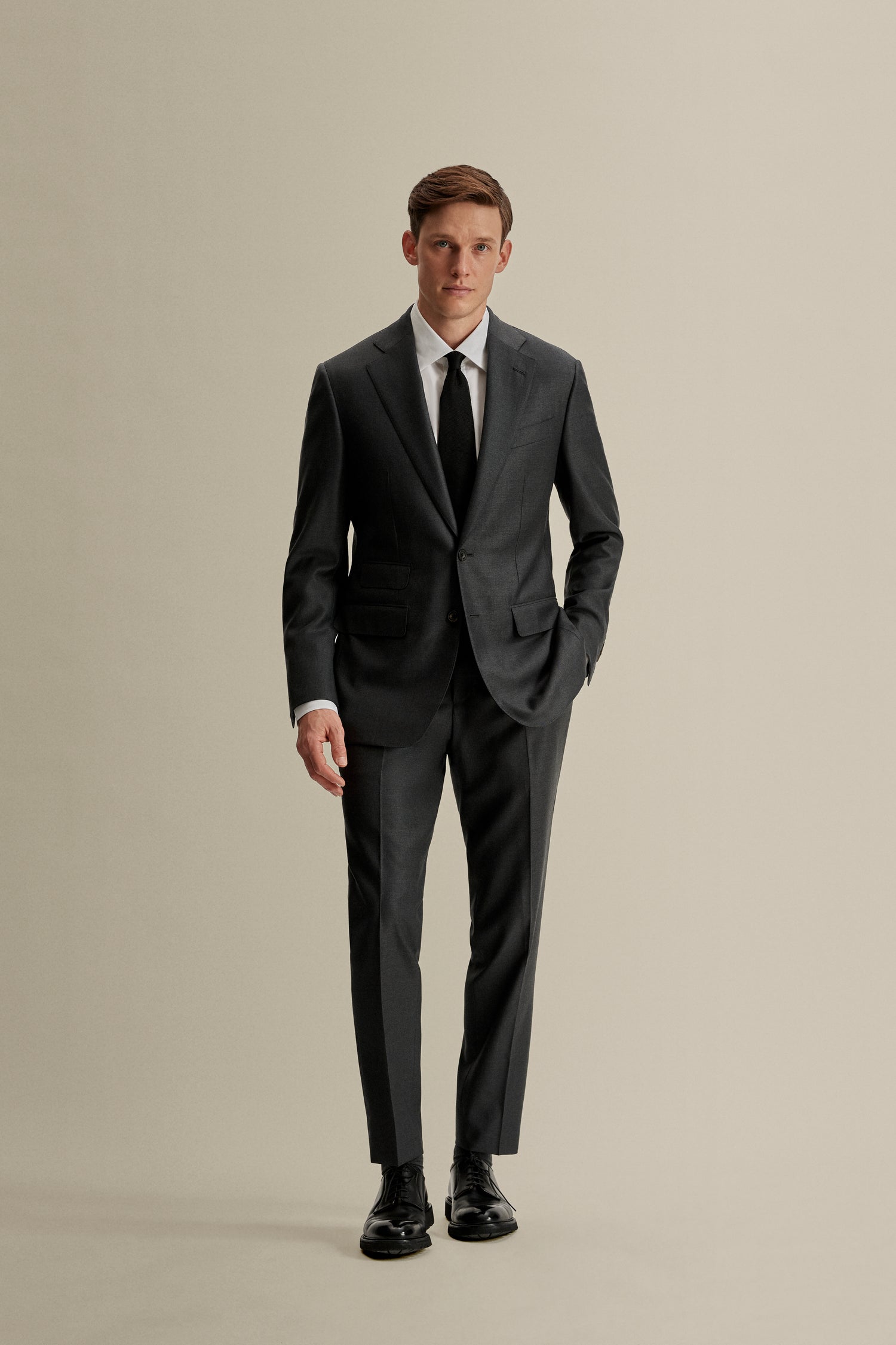 The Weighhouse suit embodies what we do best. Sharp yet soft, it’s cut from the finest grey wool and boasts our signature unstructured house cut. The jacket has a two button front, subtle notch lapels, and flap pockets, while the trousers have a distinctive tapered silhouette that makes the wearer look slimmer and taller.