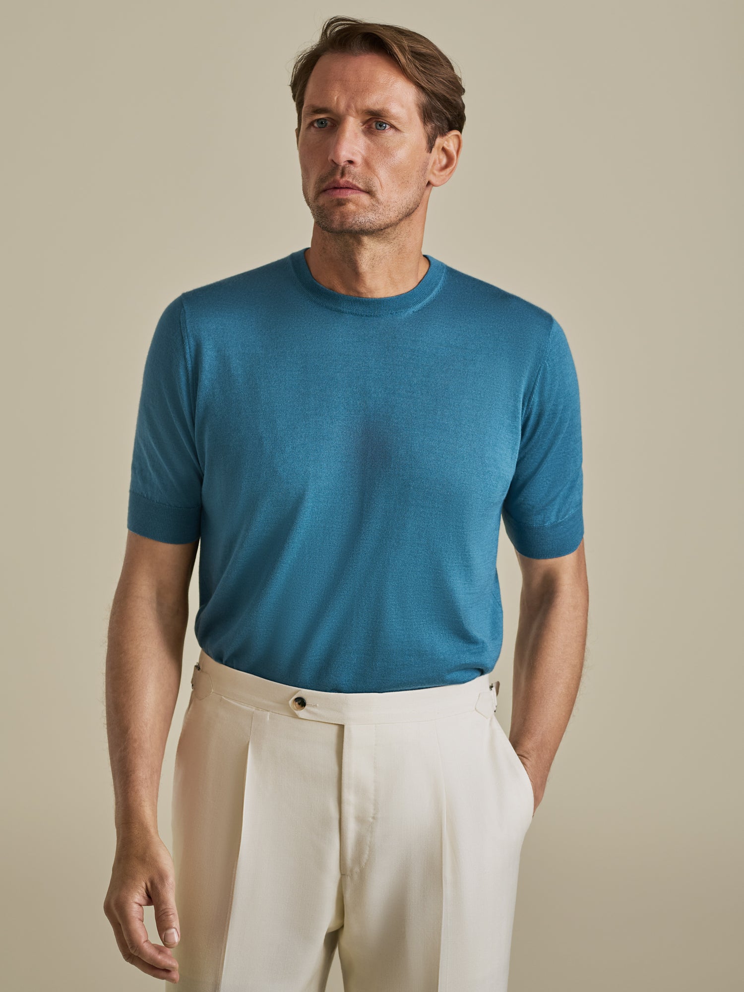 Crafted in Italy from the softest cashmere silk, this mid blue T-shirt is summer knitwear at its most refined. With ribbed cuffs and hem, a flattering tailored fit and set-in short sleeves, it’s a comfortable, elegant option that’s smarter than a regular T-shirt but more relaxed than a polo.