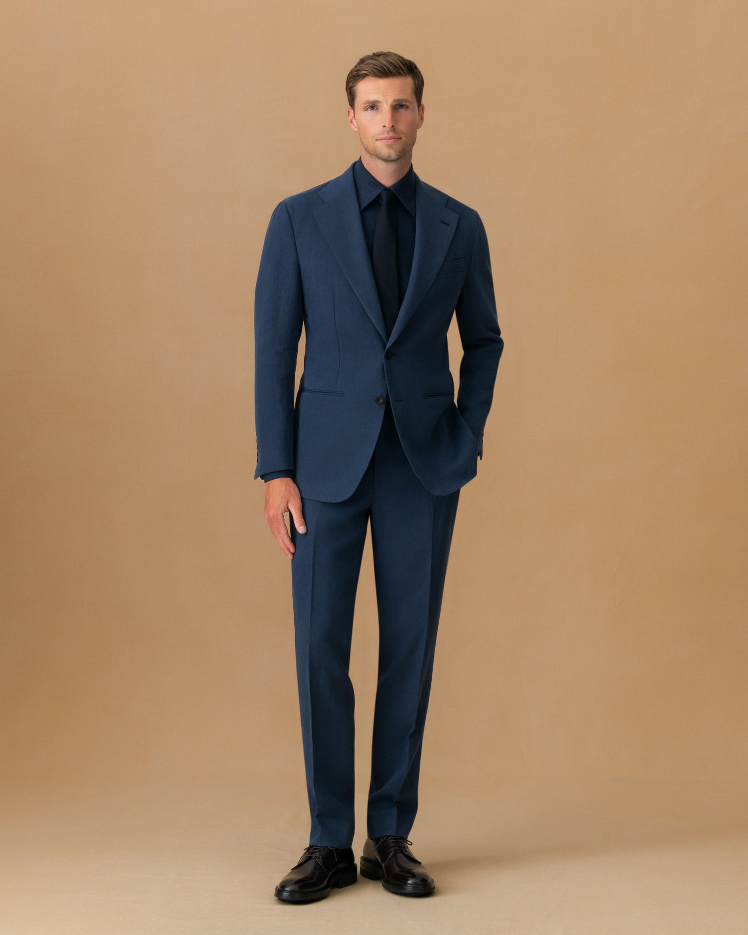 Handmade in Italy, this two-piece suit is cut from a heavyweight mid blue linen, giving it more structure and a unique drape. While dense and durable, the fabric remains incredibly soft to the touch. For an effortlessly cool alternative to wool or cotton, this autumn-weight linen certainly fits the bill.