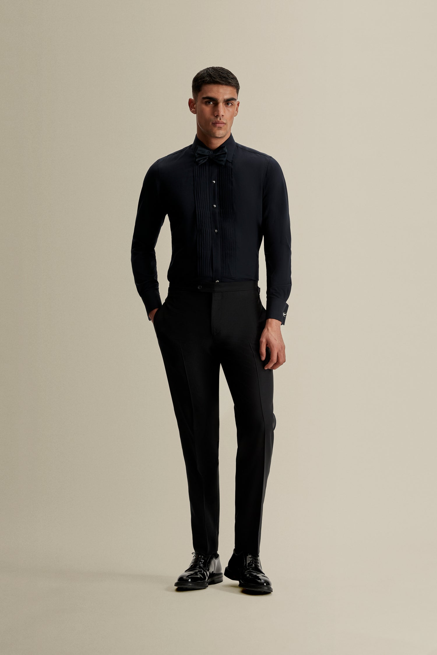 A timeless pair of evening trousers, cut from the finest midnight navy wool and finished with satin stripe tuxedo detailing and side adjusters for the perfect fit. Our signature tapered cut, with a mid rise and slim leg, these will complement a tuxedo jacket perfectly.