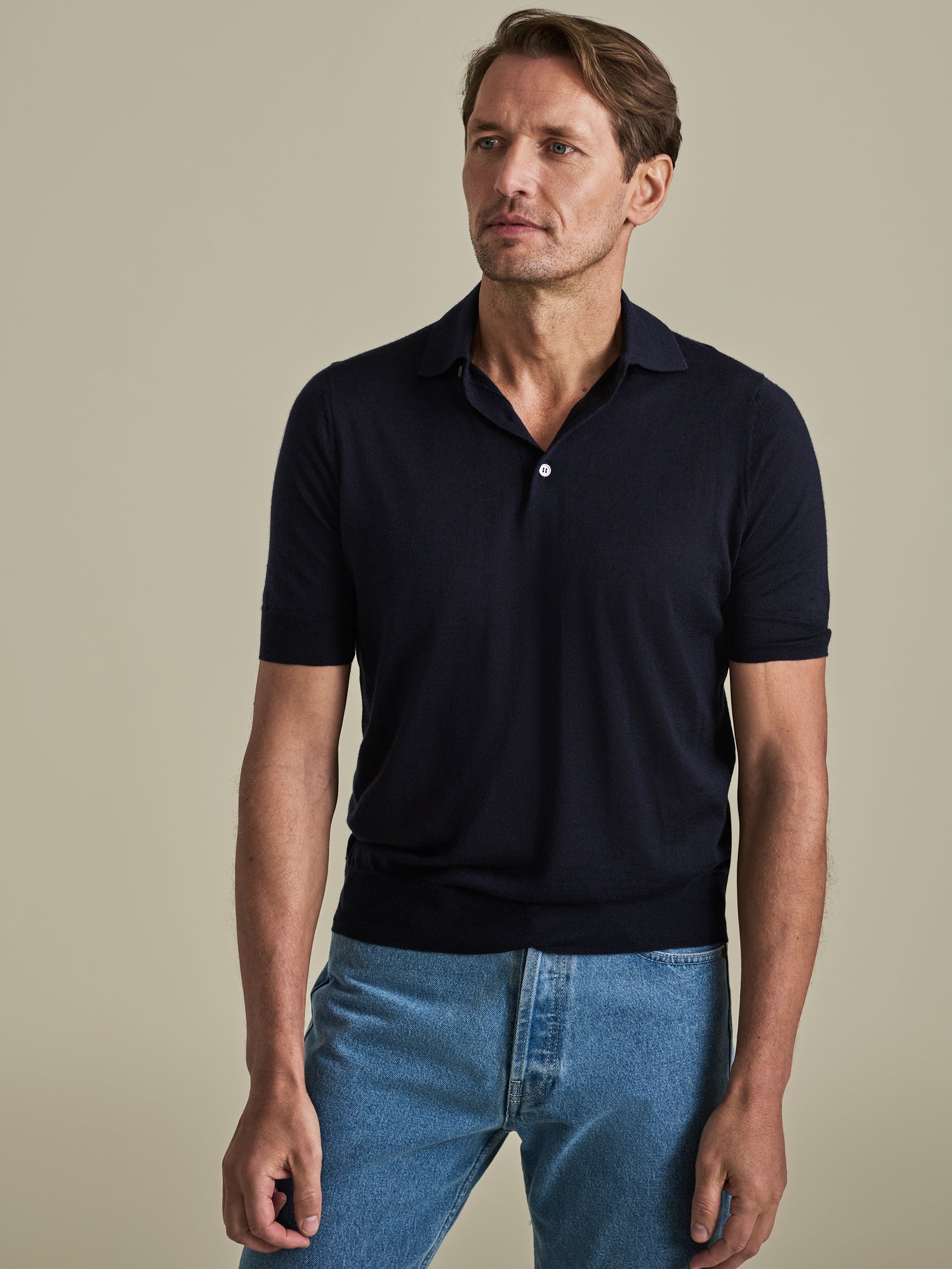 An opulent take on the classic polo shirt, reimagined in a navy colour cashmere silk fabric. Handmade in Italy, it’s designed to be the ultimate summer polo, and is most at home on sun-drenched terraces somewhere in the Riviera.