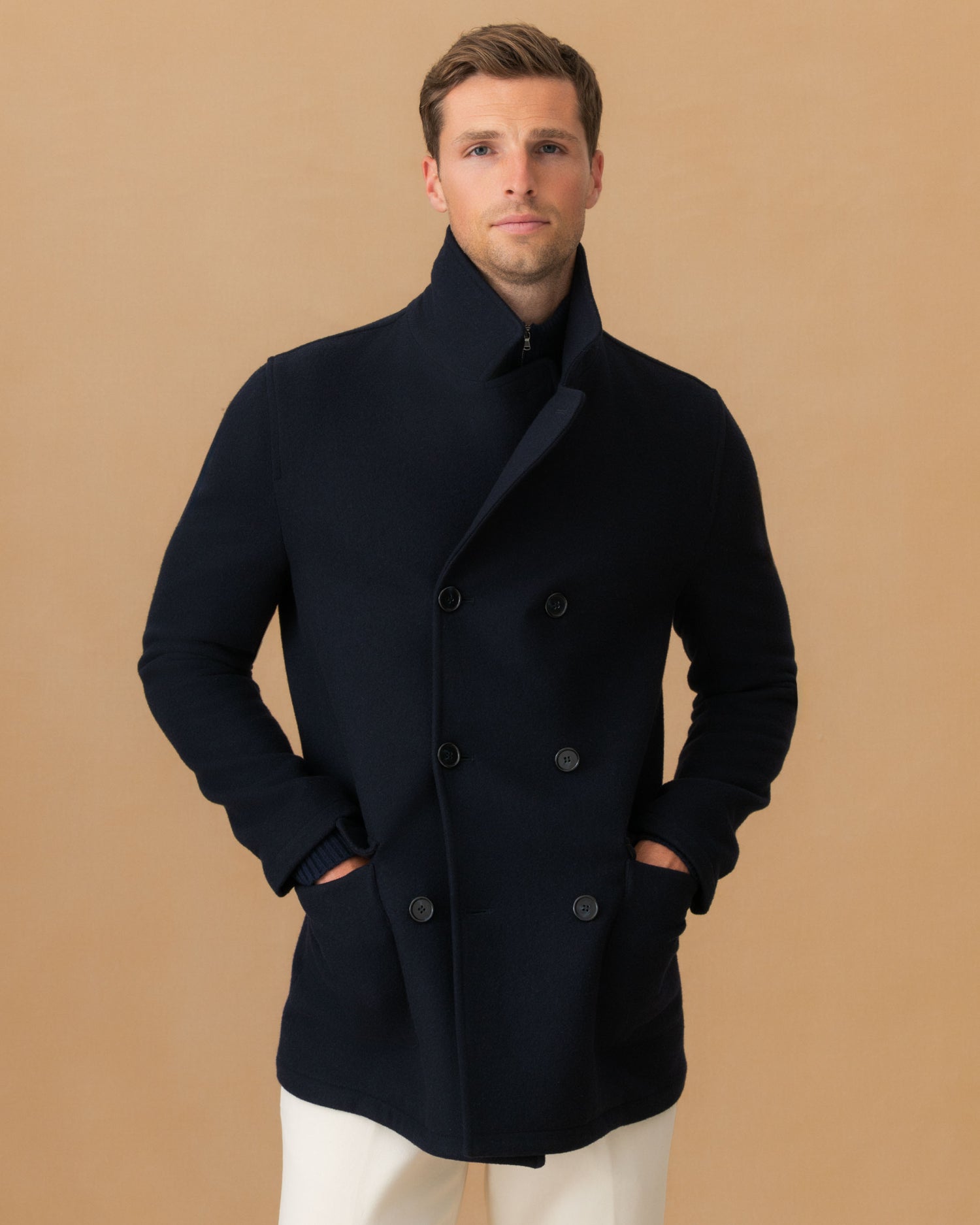 A classic outerwear piece crafted from a soft yet durable navy double wool, this pea coat is designed to last. Its sharp naval style features two front pockets, as well as the characteristic double breasted closure that looks smart and keeps you warm.
