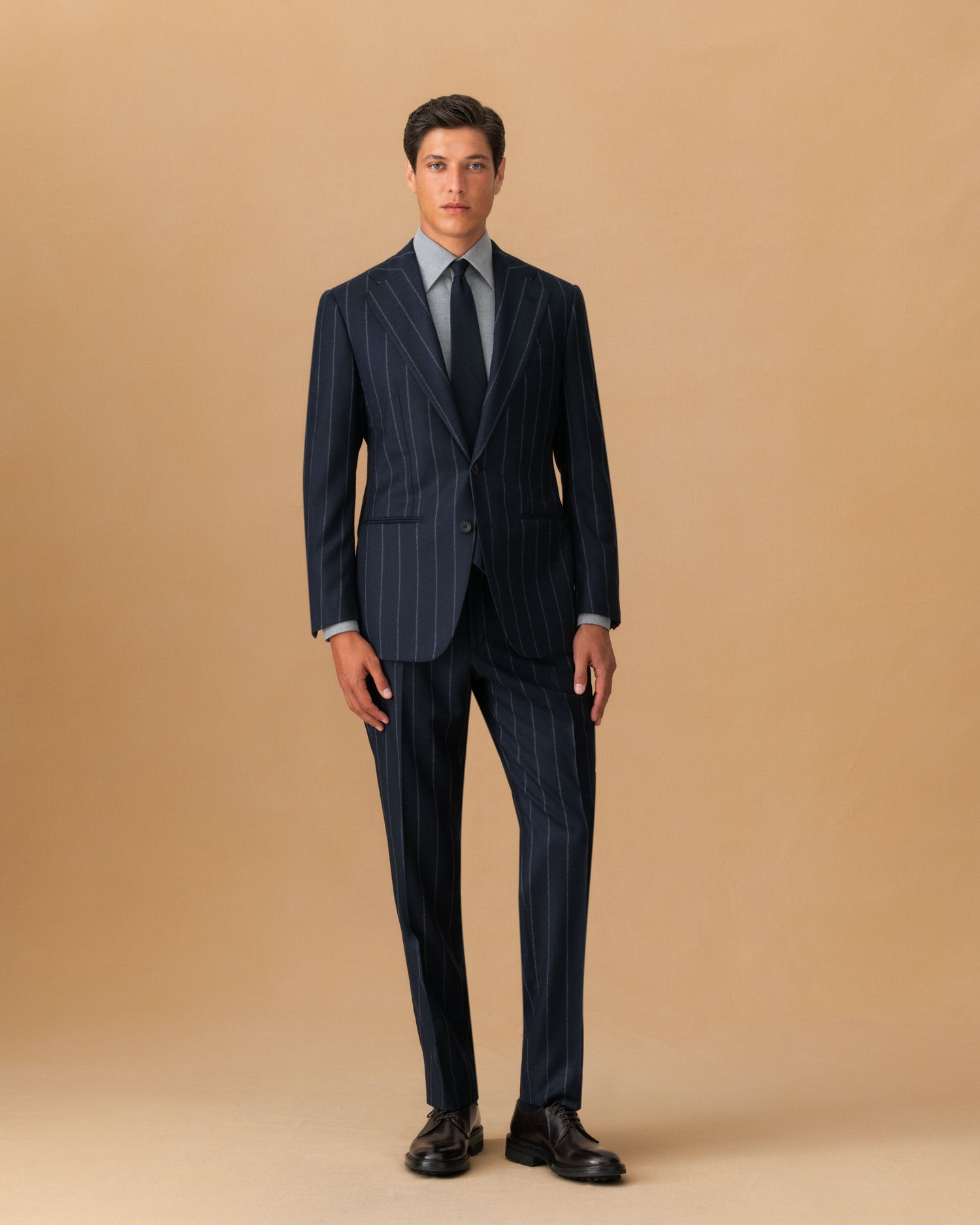 For times when you really need to make an impression, our navy pin stripe suit is more than up to the job. Cut from a seriously soft wool cashmere fabric, its soft chalk stripe references classic business tailoring, but its soft, unstructured cut gives it a more comfortable, relaxed feel.