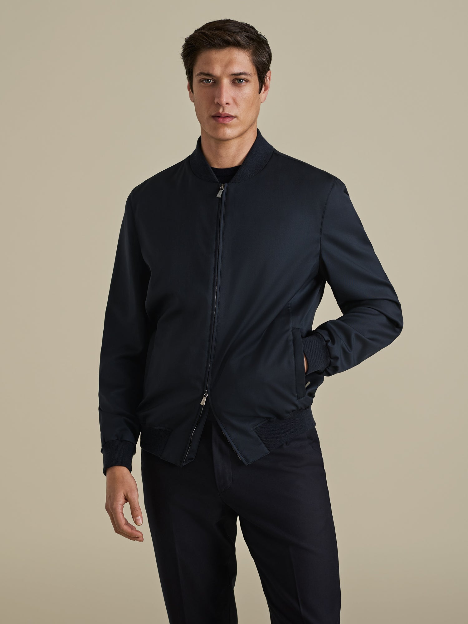 A contemporary update on the classic US military bomber, this navy jacket comes with a knitted baseball collar for added comfort. Cut from our innovative technical wool fabric, we’ve designed it to be extraordinarily lightweight and travel-friendly, whether you wear it on the commute or for long-haul jaunts.