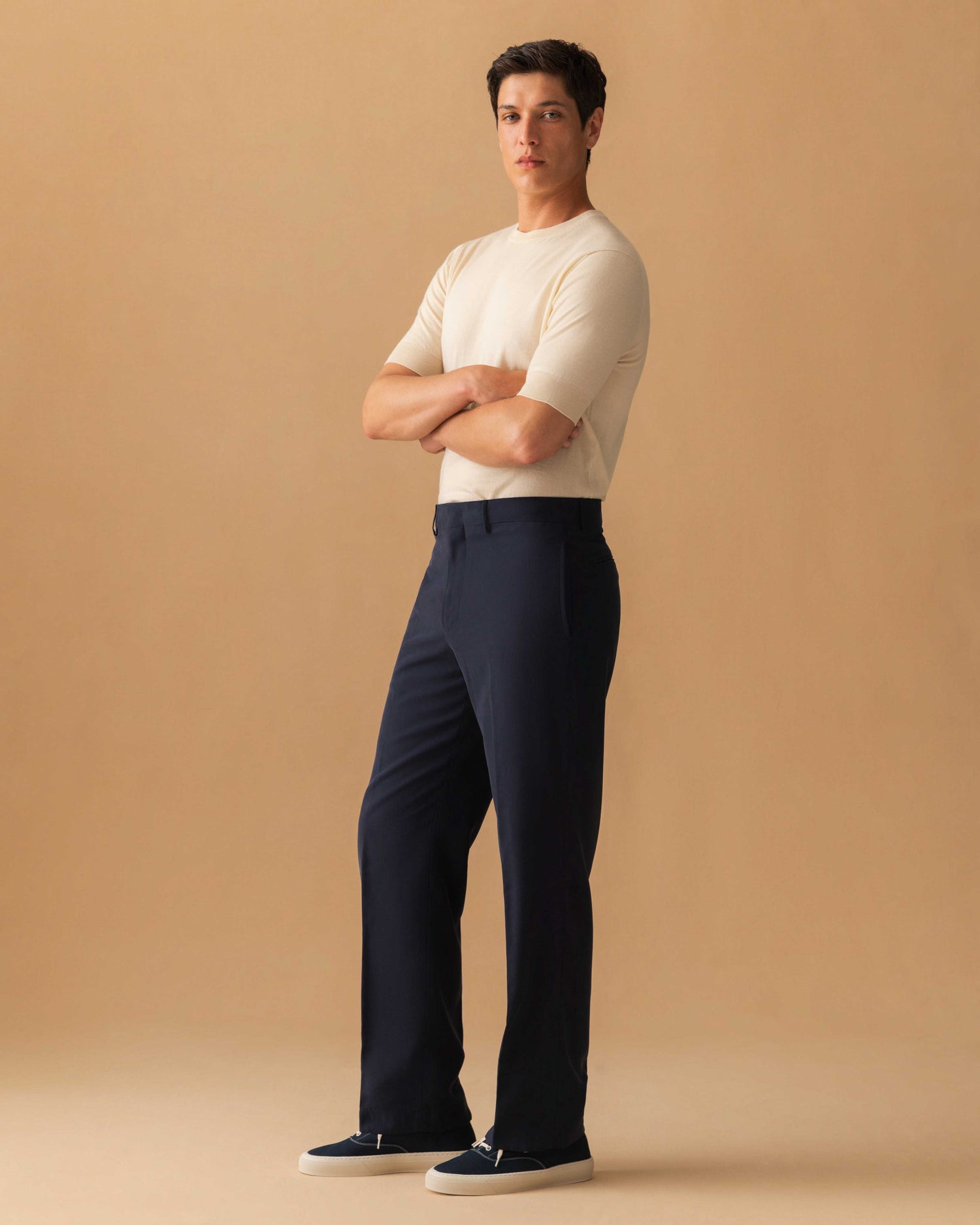 Embodying the elegance and sophistication of mid-century dress, these navy viscose trousers come with a flat front and a wide leg. The clean, high waistband combines with straight cut side pockets, which sit flat against the hips, while the soft and light viscose fabric offers both comfort and breathability.