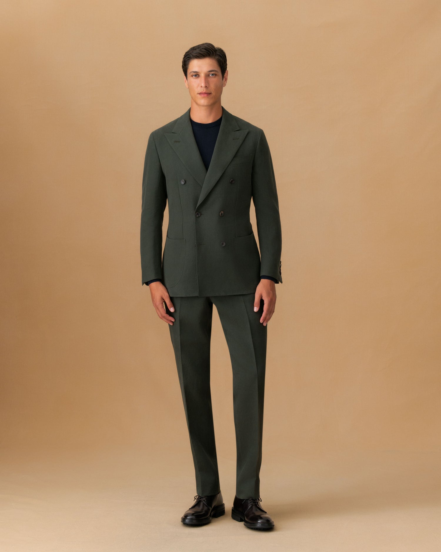 Cut from our heavyweight linen, this olive green double breasted suit is an elegant alternative to wool or cotton winter tailoring. The dense, heavy handle of the fabric combines with a softness and breathability not found with traditional wool, while the sharp, double-breasted cut and strong peak lapels draw from the glamour of old Hollywood.