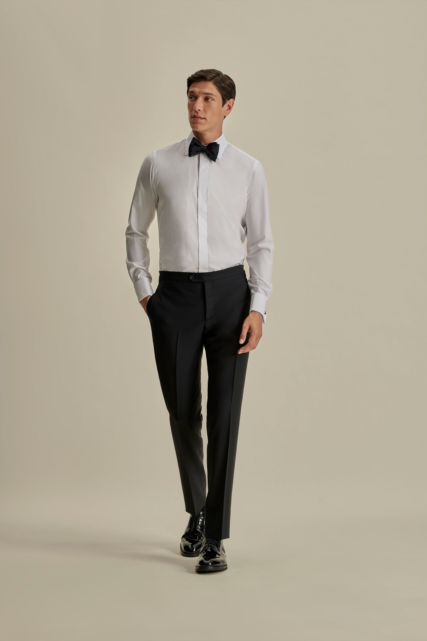 The hidden placket, standard collar and French double cuffs ensure this is best worn for formal occasions. Wear it with a midnight blue tuxedo and matching bow tie for a sharp evening look.