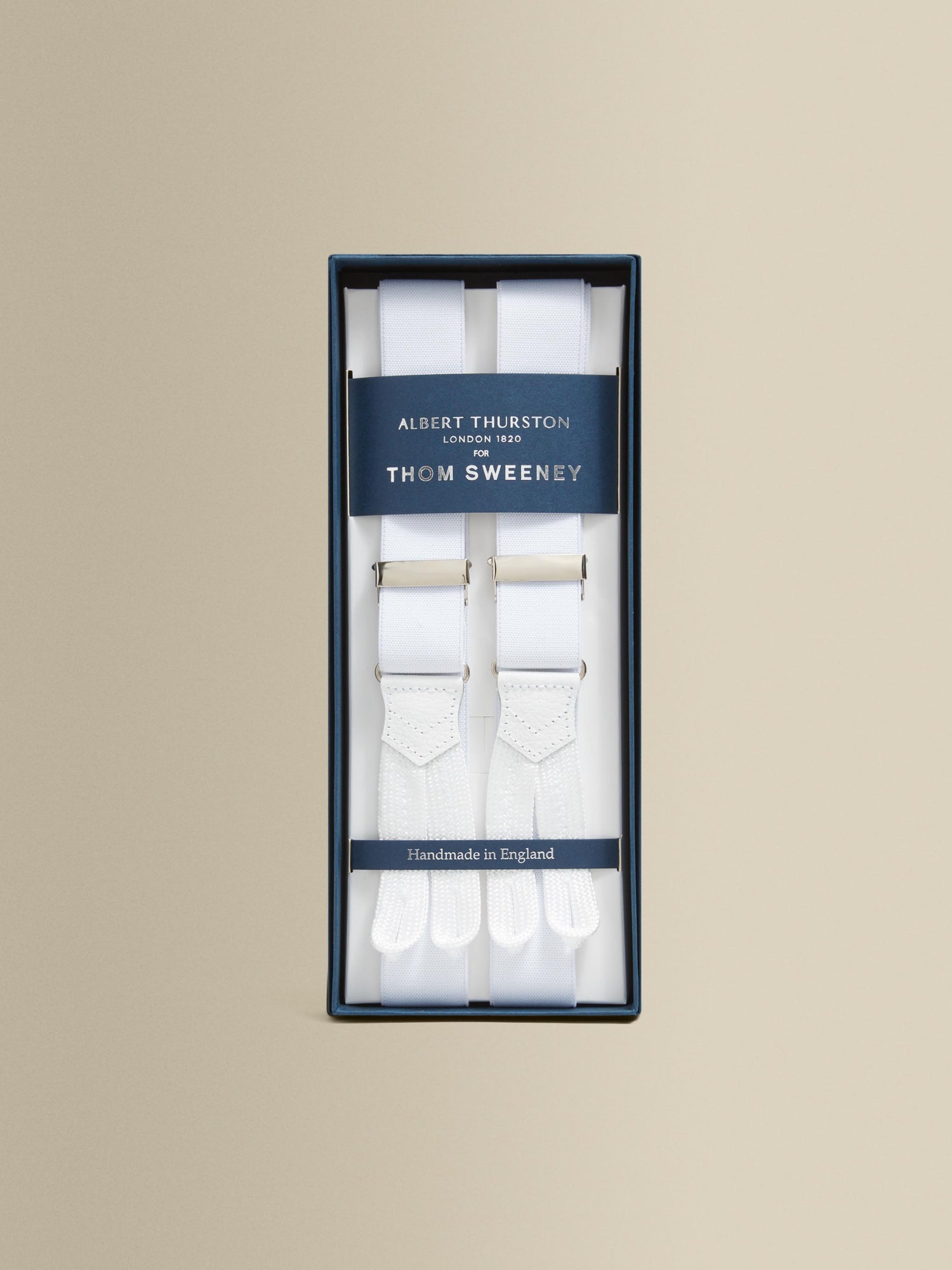 Handmade in England in collaboration with Albert Thurston and famously worn by Daniel Craig as James Bond, these all white elastic and leather braces are the perfect finishing touch for evening looks.